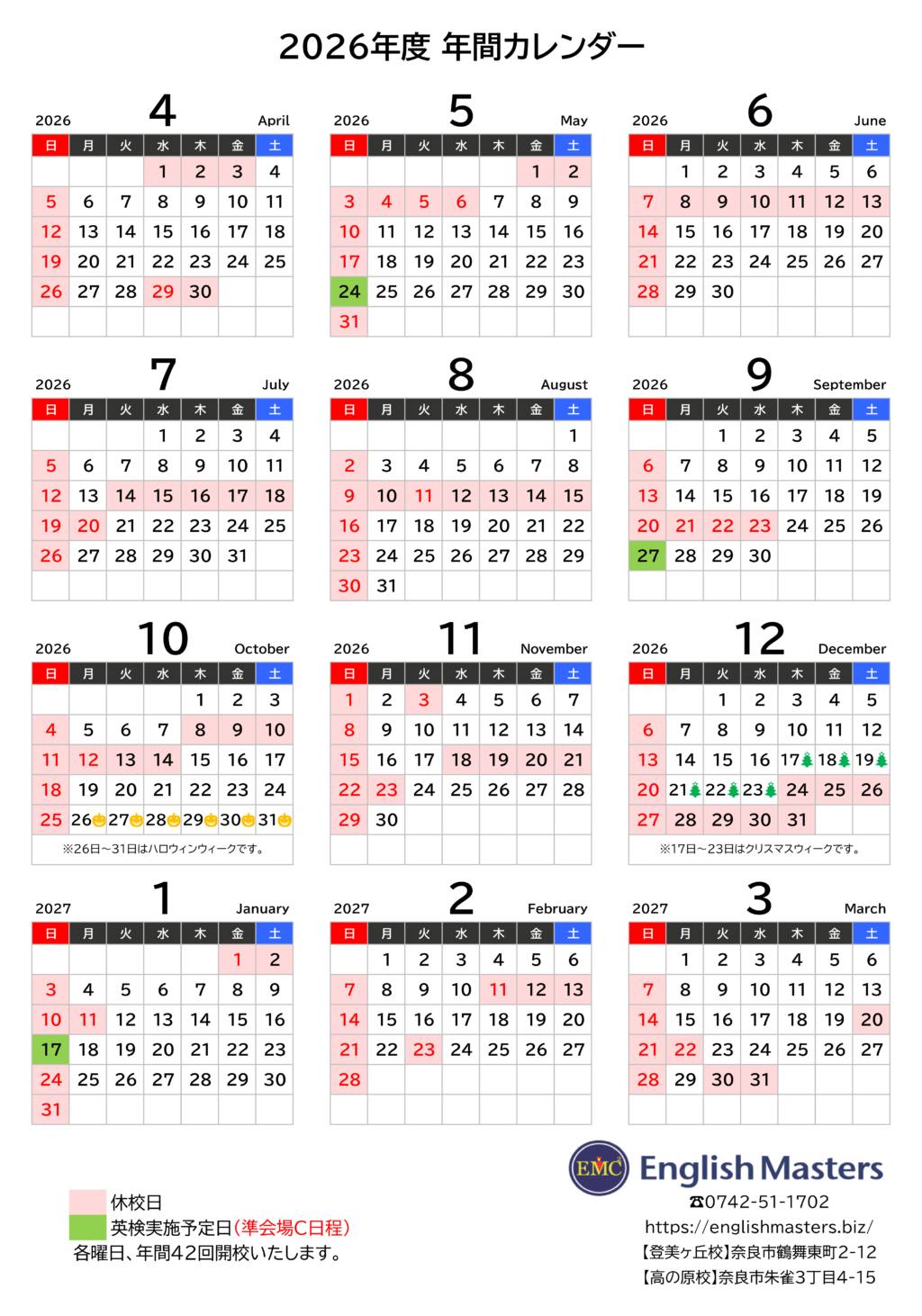 2026年度イングリッシュマスターズのスクールカレンダーです